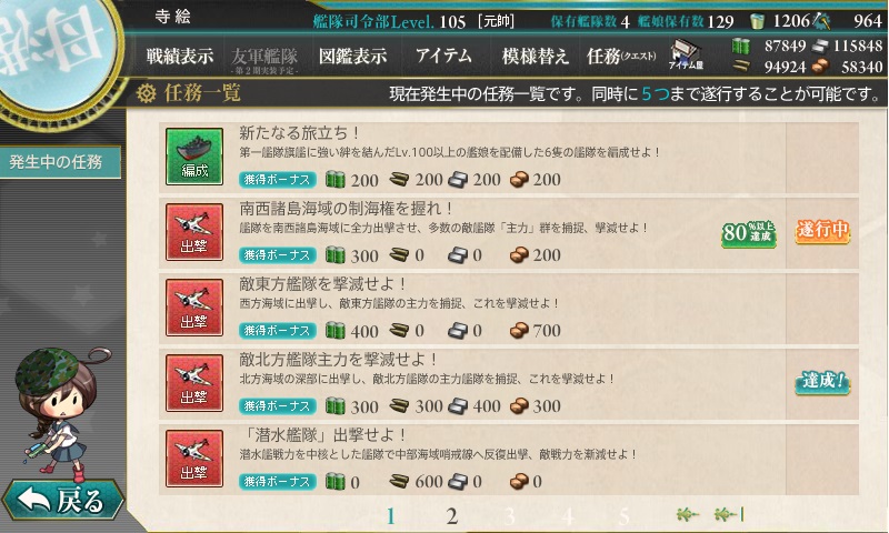 今までの「敵北方艦隊主力を撃滅せよ!」任務は、燃費が悪くボス固定ではないので敬遠していたけど、3-5下ルートを利用すれば、わりと簡単に達成できるので断然おすすめです!