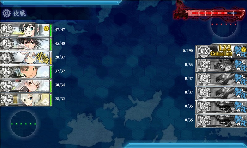 駆逐棲姫は固いけど、夜戦ならスクショのように一撃で100オーバーのダメージを与えれるので、昼戦で4人を倒しておけば支援なしでも倒せそうです。