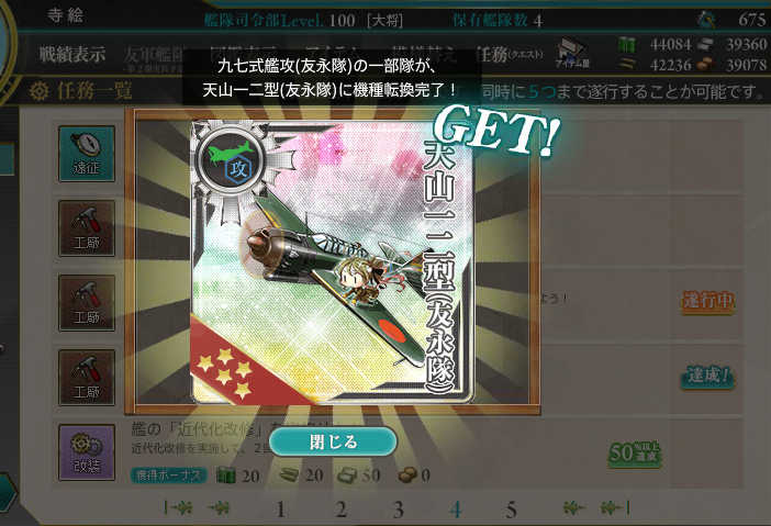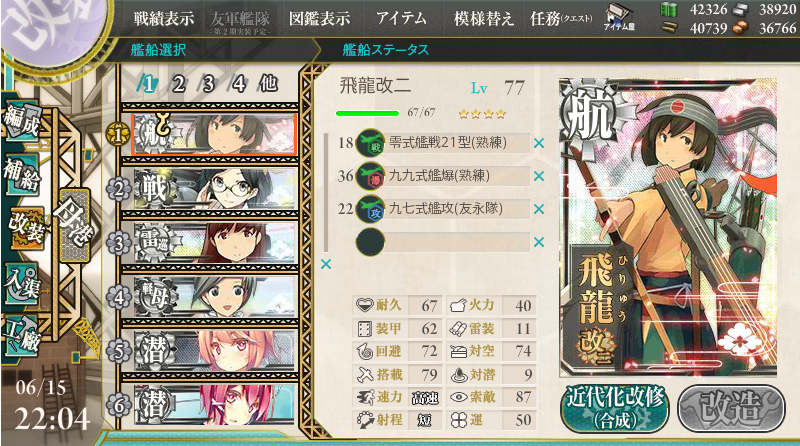 飛龍がLV77になりましたので、早速改造して天山一二型(友永隊)入手クエをやってみました!
