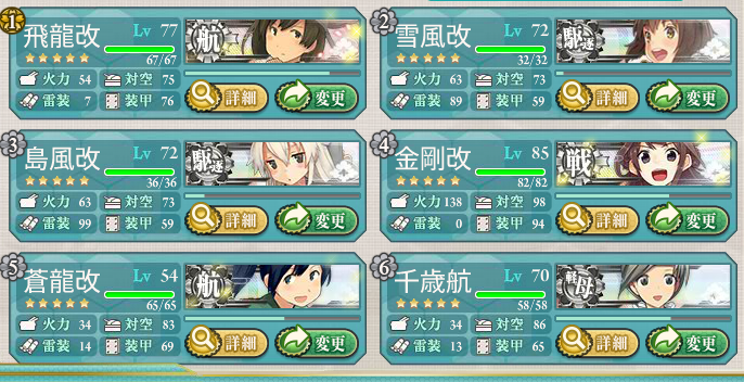 我が艦隊も、途中撤退3回(蒼龍、雪風、島風がそれぞれ大破)、A勝利3回を経て、7回目の挑戦でようやくS勝利が取れました^^