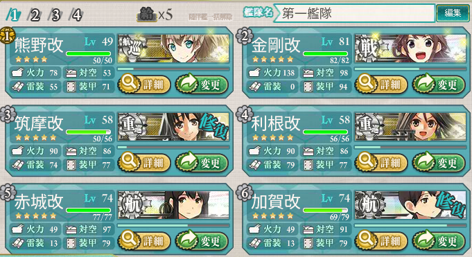バケツは1戦あたり3~4個使用するので、同じバケツを使うなら熊野さん以外の航巡がLv50以上になれば、低燃費艦隊で攻略をしてみようと思います^^;