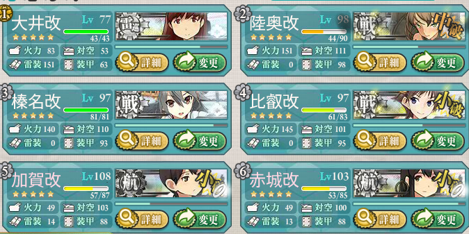 我が鎮守府では、駆逐艦の練度が低いので、北上様に昼戦で3隻・夜戦で1隻、那智さんに昼戦で1隻・夜戦で1隻の計6隻を倒してもらい、駆逐艦の皆様には大破することなくボスまで辿り着いてもらう作戦で出撃しました^^;