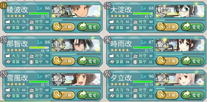 出撃2回目で渦潮を通るけどボスまで行けたので、その編成で固定しました。