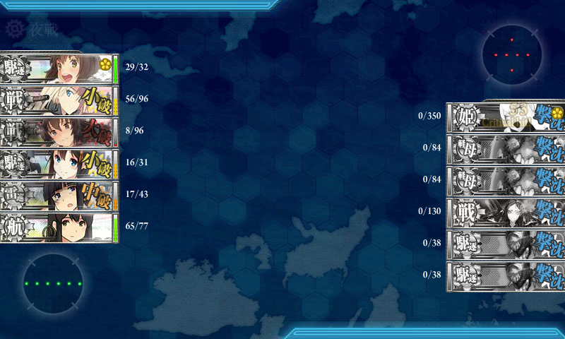 夜戦までにボス以外を沈め、夜戦で雪風さんがカットインを発動、残り50程度をビス子さんと時雨さんで削りきってくれました^-^