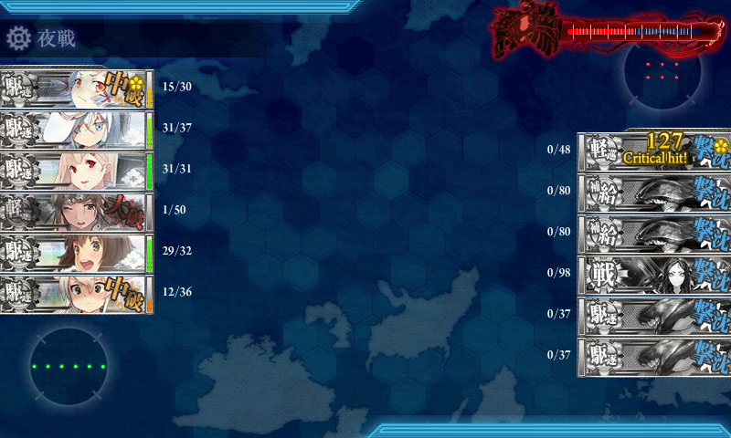 随伴艦にダメコンを装備させて大破進軍した時は「轟沈」してから復活しますが、旗艦の場合は大破進軍した時点で「中破」になるとは知らなかった~~。