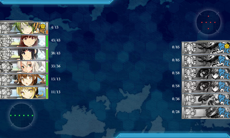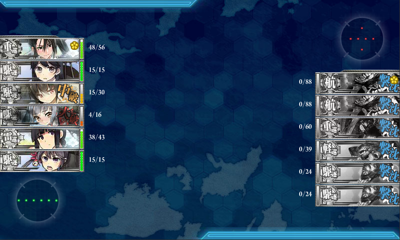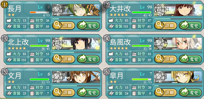 我が鎮守府では、駆逐艦の練度が低いので、北上様に昼戦で3隻・夜戦で1隻、那智さんに昼戦で1隻・夜戦で1隻の計6隻を倒してもらい、駆逐艦の皆様には大破することなくボスまで辿り着いてもらう作戦で出撃しました^^;