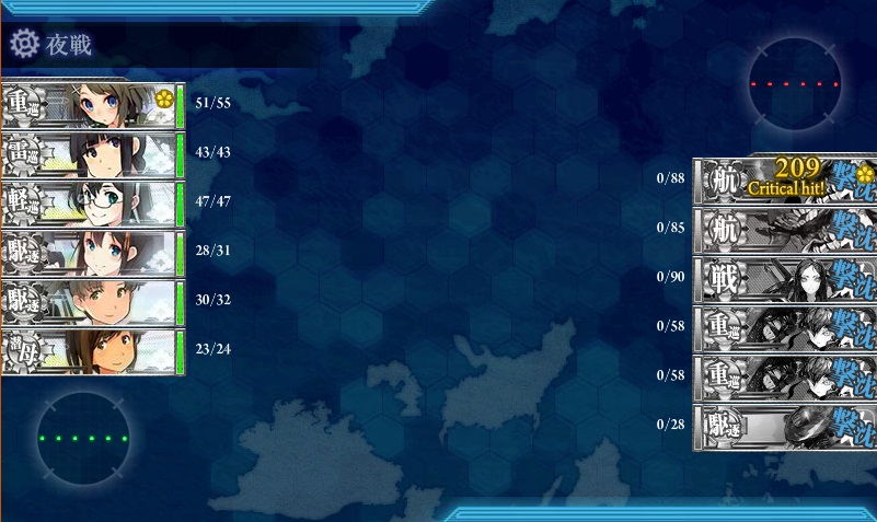 ボス戦でT字不利を引いたため、那智さんが昼戦で1隻沈め損ねましたが、夜戦で初霜さんが重巡を沈め、最後は北上様が空母に止めを刺してクリアしてくれました^-^