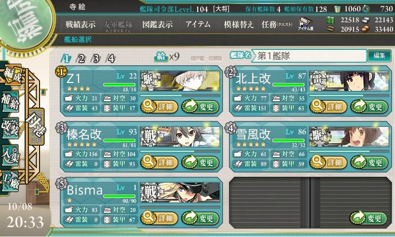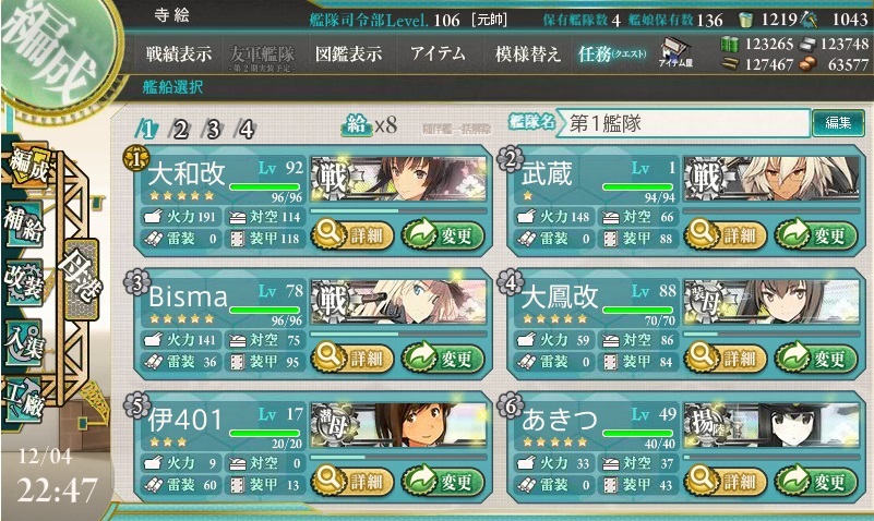 夜戦を視野に入れれば大和型に並ぶ火力を備えたビス子さんの活躍が楽しみです^^