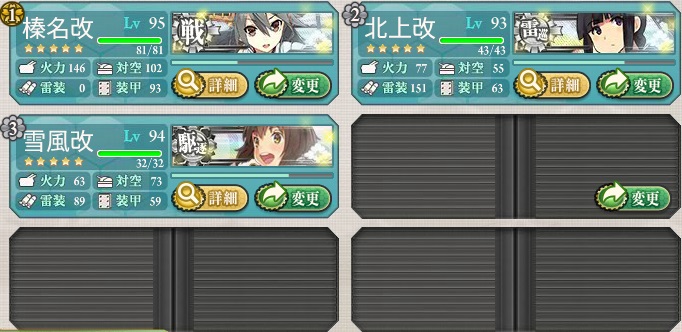 もちろん、旗艦はレーベちゃんにして、随伴艦として5-5立役者の榛名さん、夏イベの神様である北上様、運最強の雪風さんを添えて運気を高めます。