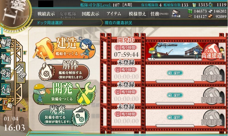 装備の強化ができる明石さんの改修工廠ですが、大型建造がコンプするまで凍結します。