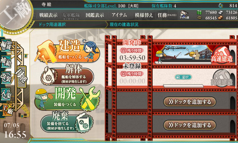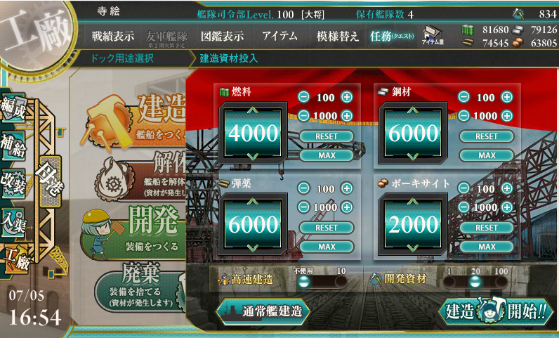 とりあえず1回まわして、後は油、弾、鉄を10万まで貯めて、10万を切らないように大型建造を回す予定です。