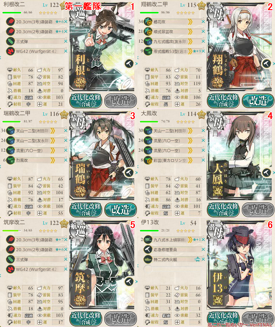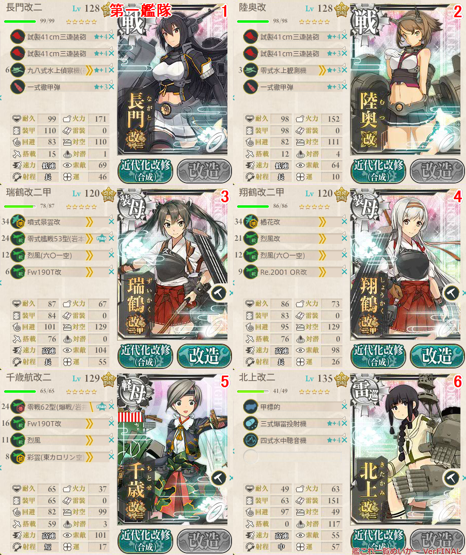 ボスマスは制空権とれなくても問題ありませんが、攻撃機の熟練度が禿げないように烈風系を2スロに乗せました。
